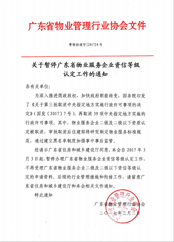 关于暂停广东省物业服务企业资信等级认定工作的通知